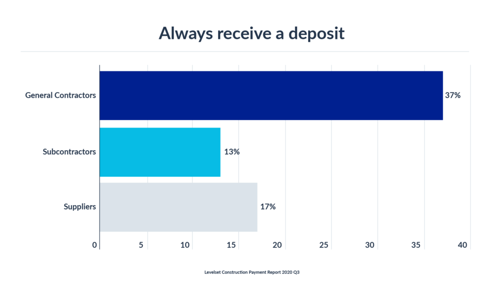 The gap between construction companies begins well before the first payment application is sent. Lest you complain that the days of upfront deposits are gone in construction, consider this: 37% of GCs say they always receive an advance payment. Unfortunately, they’re not as willing to extend the offer to the companies they hire. Only 13% of subcontractors get a deposit.