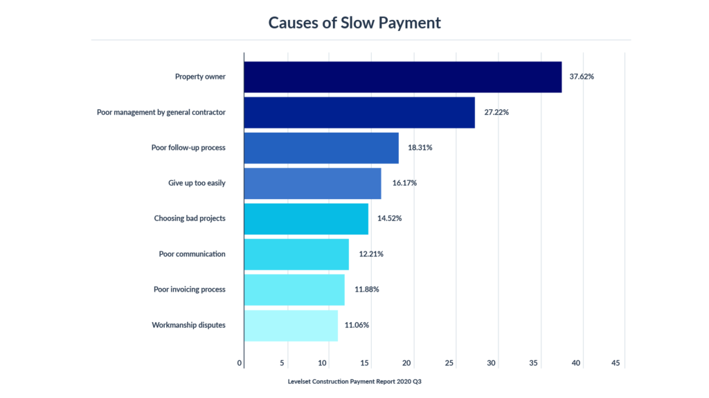 But according to the survey, two parties carry most of the blame: Property owners and general contractors. 38% of all contractors say slow payment is primarily caused by the property owner’s cash flow problems. More than 1 in 4 blame payment delays on poor management by the GC.