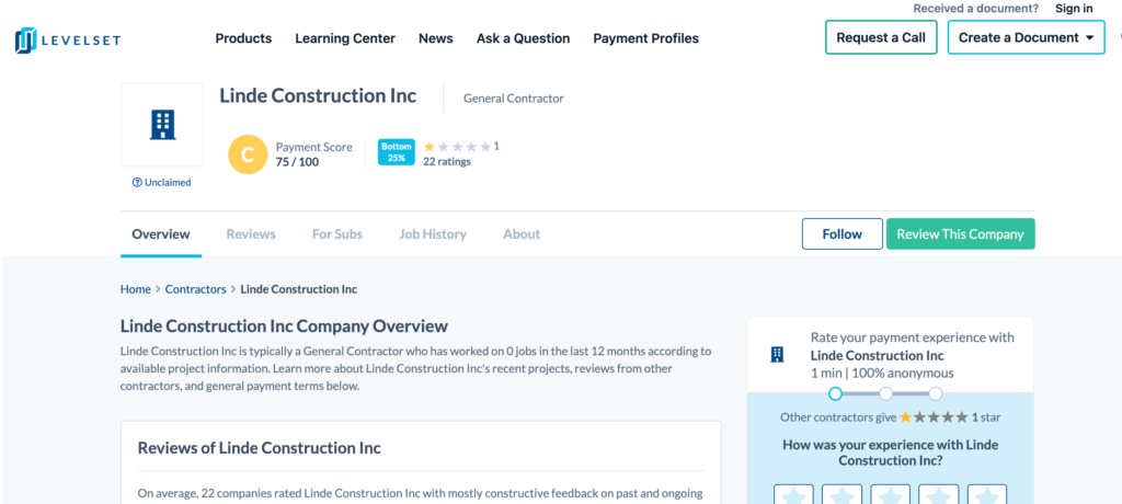 Notably, recent comments made by contractors to Levelset about Linde Construction make harsh assessments about the company’s leadership, with one contractor calling them “One of the worst in the industry,” and another making the inflammatory claim that they are “Complete scams [sic] artists!”