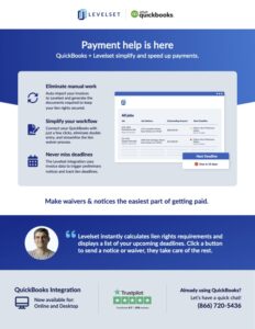 Levelset and Quickbooks have teamed up to simplify and speed up payments in order to make construction paperwork as stress free as possible. With the built-in integration, you can say goodbye to manual work, simplify your workload, and never miss a deadline.